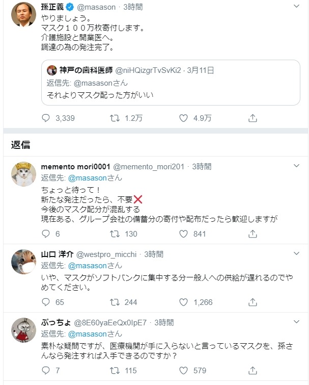 「孫 正義 今度はマスク100万枚」