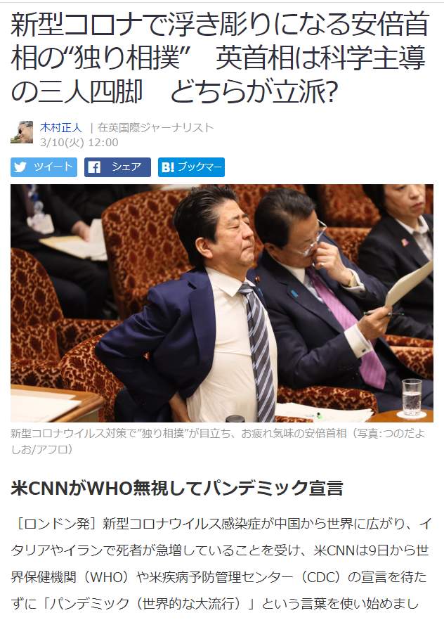 安倍首相は新型インフルエンザ等対策特別措置法を改正して緊急事態宣言を行い、新型コロナウイルスをねじ伏せて五輪開催にこぎつけたいのでしょうか。首相がこれまで以上に“独り相撲”を取り出すと、戦いの最前線である医療現場が大混乱してしまう恐れがあります。>>1