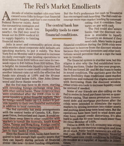 월스트리트저널(WSJ)은 10일(현지시간) 'Fed의 시장 안정책'이라는 제목의 사설에서 10년만에 발생한 금융시장 패닉을 가라앉히기위해 Fed가 한국과 중국, 대만, 홍콩, 호주와 통화스와프 계약을 맺을 필요가 있다고 밝혔다. 무역이 많은 이들 국가와의 스왑은 국제 금융시장에서 달러 수요를 안정시키는 데 필요하다는 얘기다. 통화스와프는 외환위기 등 비상시에 상대국에 자국 통화를 맡기고 상대국 통화나 달러를 받을 수 있도록 하는 계약을 말한다.