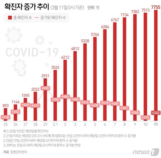 韓国国内でコロナ19新規感染者が新たに242人発生し、確定患者は合計7755人になった。