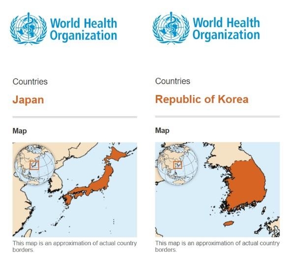 現在WHOサイトで主要メニューのうち、国家情報サービス(country)で「韓国」をクリックすると、韓国の地図には独島と鬱陵島が抜けているが、日本の情報紹介のページに入ると、地図に鬱陵島と独島が表記されている。地図だけ見れば、世界人たちが鬱陵島と独島を日本領土と認識してしまうのだ。