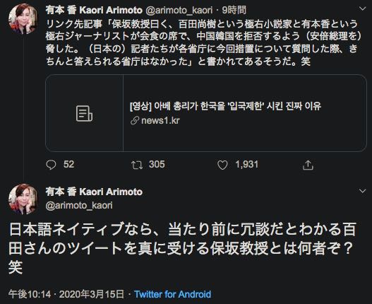 保坂教授は11日にnews1とのインタビューで、「先月28日、百田尚樹という極右小説家と有本香という極右ジャーナリストが(安倍総理を)会食の席で脅迫し、中国と韓国を拒否するように話した」とし、「安倍総理の独断的な決定だったため、(日本の)記者たちが(日本の)各省庁に今回措置について質問した際、きちんと答えられる省庁がなかった」と伝えた。