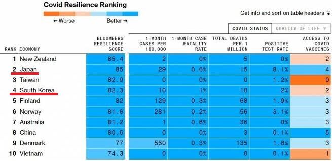 24日、ブルームバーグが分析して指数化した「コロナ19」対応に長けている国の順位、1位はニュージーランド、2位は日本、3位は台湾で、K-防疫をホルホルする大韓民国は4位だった。