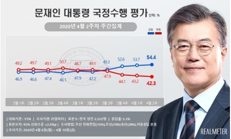 リアルメーター関係者は「新型コロナウイルスに政府がよく対応したとの評価が大統領支持率の上昇を後押ししたとみられる」として、「総選挙(15日投開票)を控え、進歩(革新)陣営が結集した効果もあるようだ」と分析した。