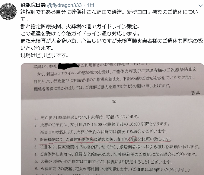 「コロナ感染による肺炎死亡者」と同様に「袋に納めて消毒します」とツイートしているだけだ。アホww