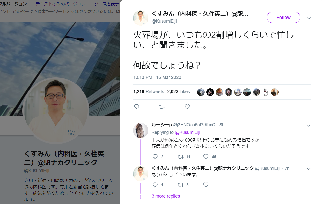 久住英二って見覚えあると思ったら、ツイッターで葬儀屋が二割増し忙しいとかつぶやいて批判された医師じゃん。いまみたら削除されてたけどキャッシュが残ってた。ん~よくわからんな