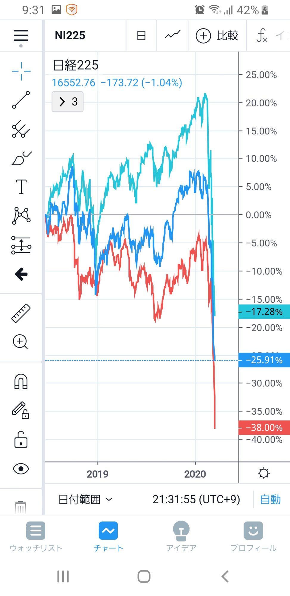 以下のグラフはNYダウ、日経平均、kospiの値動きを示したもの。