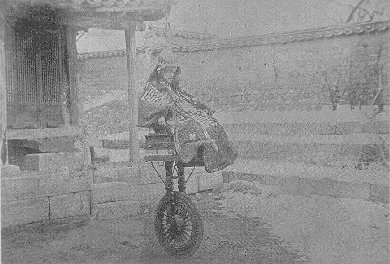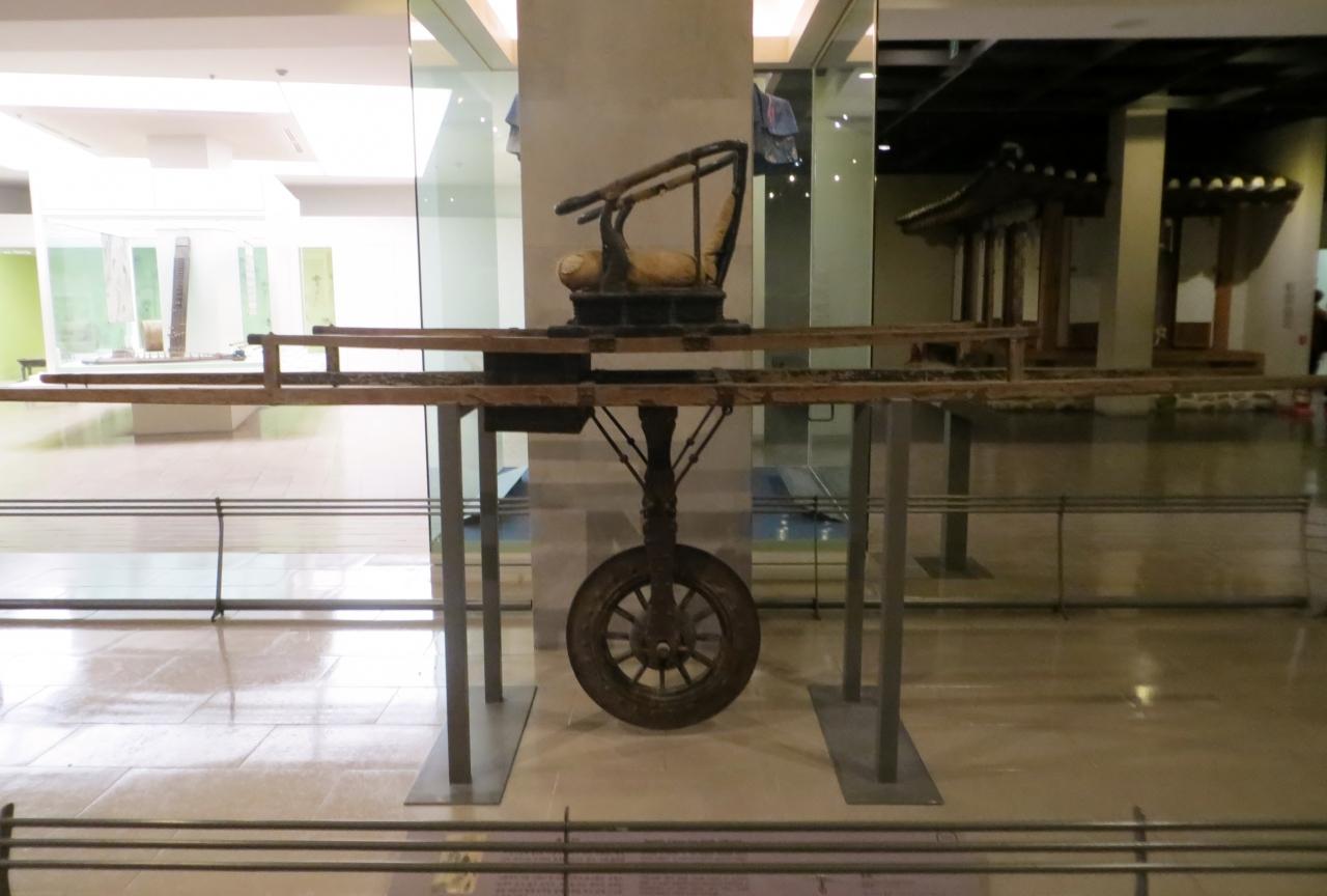 ③ 車輪は難しい。特に一輪車仕様の輿の車輪は、作成には技術的に難しかったであろう。写真の車輪は既に傷んでいる様に視え、耐用年数を超えているかの様だ。しかし、写真により、存在はしたし、それを全否定する根拠は無い。確かに、併合の一世紀前の学者の記述には車輪が作れないとは在るが、その後は判らない。それ以降の史料の詰めと、文化財の発掘鑑定を進め、何時から作れたかを探って頂きたいところだ。