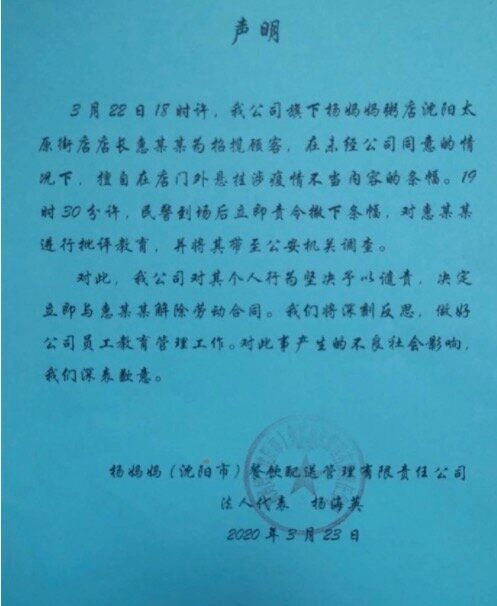 チェーン店を運営する「楊媽媽(やんまーま)」は、店長が本社の許可なく行ったなどと釈明し、即座に解雇したと発表。「社会に良くない影響を与えてしまい、誠に申し訳ありません」などと陳謝した。