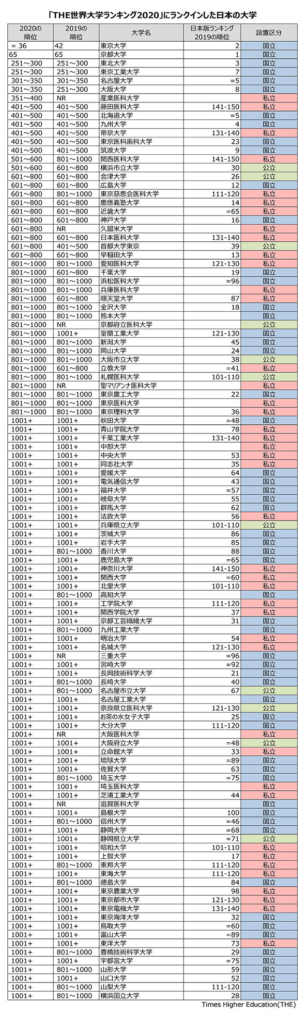 日本のランクイン数は前回の103校から110校に増え、設置者別に見ると国立57・公立11・私立42となっています。