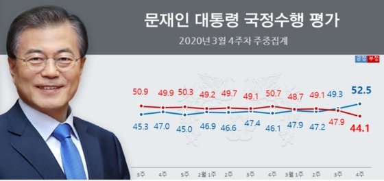 世論調査専門機関「リアルメーター」がtbsの依頼で去る23日から25日まで、全国18歳以上の有権者1518人を対象に実施し、26日に発表した2020年3月第4週目の週間集計結果によると、文大統領の国政遂行支持率は、3月第3週目の結果に比べて3.2ポイントアップの52.5%と調査された。