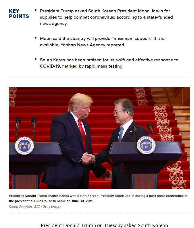 https://www.cnbc.com/2020/03/24/coronavirus-response-trump-requests-supplies-from-south-korea.html>>58 어... 진심이 안 느껴진다.