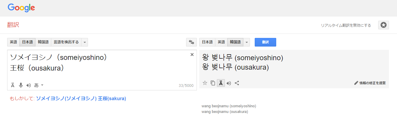 ソメイヨシノと書いても韓国じゃ王桜と翻訳される。
