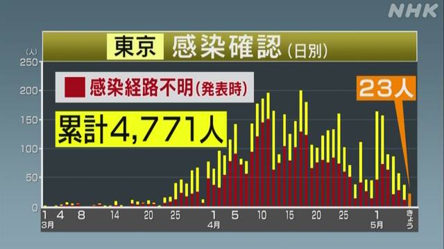 少なくなってきているけれど、連休が終わって検査数が元に戻るとまた増えるだろ東京都 新たに23人感染確認 5日連続で100人下回る 新型コロナ