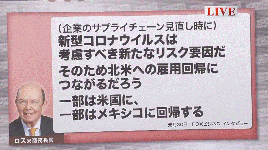 5名無し2020/03/25(Wed) 19:15:15ID:Y1MzkwMjU(1/2)NG報告何故に中国外交部が興奮してるか?記事の内容より深いみたいね世界は武漢コロナ鎮圧後に向けて動き始めてる世界がサプライ・チェーンから中国を除外する中国以外に分散することを始めようとしてる日本でさえ安倍首相が国会答弁でで回答してる麻生財務大臣はトヨタを皮肉ってる(トヨタは中国の5つの工場を停止した)画像はアメリカさんの動きの一つ (の解説)10