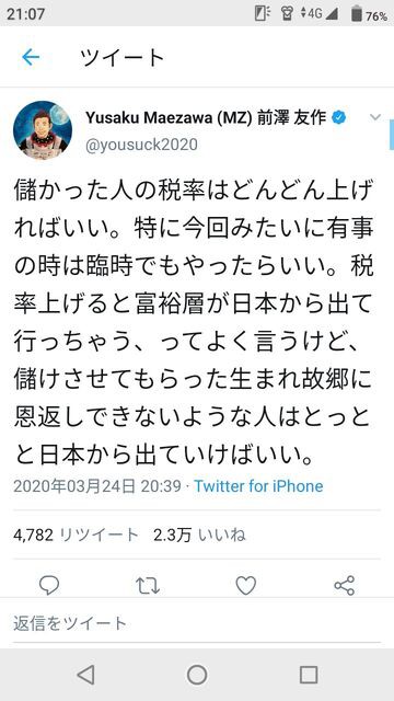 ZOZO前澤「金持ちの税率を臨時で上げろ。生まれ故郷に恩返しできないやつは日本から出てけ」