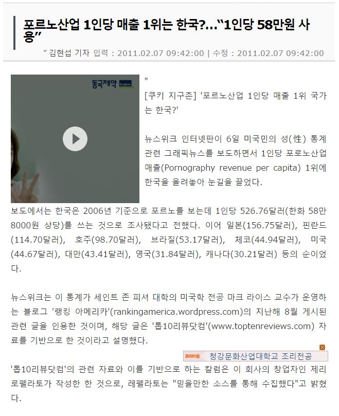 1人当りのポルノ産業の売り上げの(Pornography revenue per capita)第1位に韓国を挙げて注目を集めた。