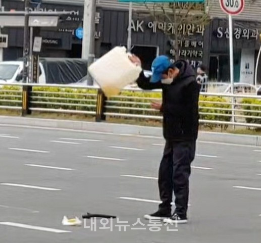 다행이 사람들의 통행이 많은 곳이라 지나가던 퀵 배달원이 기름을 머리위로 붓는 것을 보고 즉시 달려가 라이터로 불을 붙이는 것은 막았으나 지나가던 시민들이 소리를 지르며 크게 놀랐다.