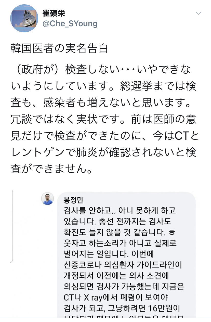 【衝撃】韓国医師が実名で告白「総選挙までは検査も感染者も増えないと思います。」