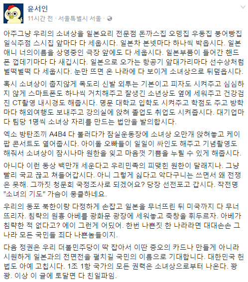 다음 정권은 우리 더불민주당이 딱 잡아서 이딴 증오의 카드나 만들게 아니라 시원하게 일본과의 전면전을 펼치길 국민의 이름으로 기대합니다. 대한민국 헌법도 아예 고칩시다. 1조 1항 국가의 모든 권력은 소녀상으로부터 나온다. 꽝꽝. 이상 이 글에 토달면 다 친일파.>>1