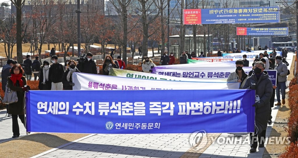写真は、2月に延世大キャンパスで行われた柳教授の罷免を求めるデモ。