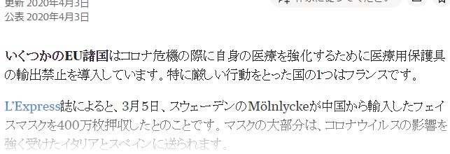 ベルギーでの生産も急遽に出来ないはずだが、どうなんだろ?今度は「アメリカがドイツ行きの中国産マスクをタイ空港で買い取る-共同通信」