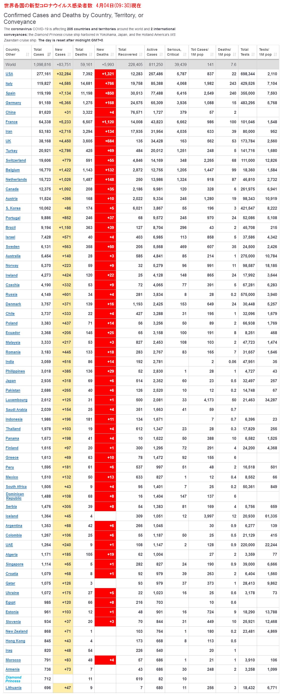 日本 773人(前日比 +5人)←クルーズ船の死亡者を除く