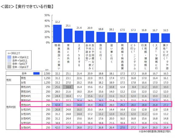 • 全体では、TOP3で「商業施設への買い物」「家族との外⾷」「旅⾏に⾏く」が上位。