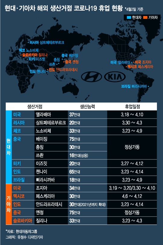 現代自動車と起亜自動車は3月末から4月中旬の間に、中国を除くすべての海外工場の生産を相次いで中断している。これにより、総516万台の水準であるグローバル生産能力は196万台に減少した。販売も急減した。先月、現代・起亜車は海外で前年と比べて20.5%減少した41万2275台を売るのにとどまった。